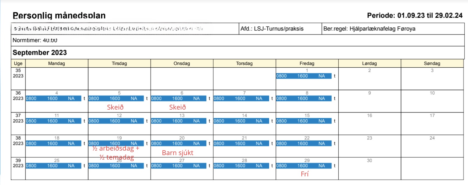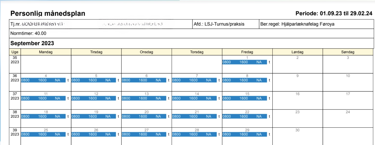 Allir útbúgvingarlæknar fáa ein mánaðarplan sendan frá lønarkontórinum. Har skal skrásetast um tey hava verið sjúk, havt barn sjúkt, verið á skeið, frí v.m.